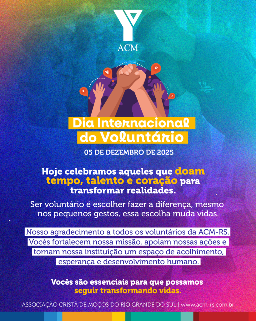 A ACM-RS agradece profundamente a todos os voluntários que caminham ao lado da instituição. Cada um deles fortalece a missão da organização e ajuda a manter vivo o compromisso com a transformação social. “Nossos voluntários são essenciais para que possamos seguir promovendo acolhimento, esperança e crescimento para tantas pessoas”, destaca a entidade. Hoje, e todos os dias, a ACM-RS celebra cada gesto que inspira e transforma.