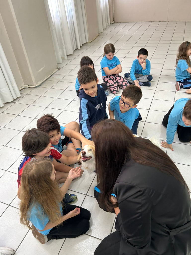 A turma também recebeu a visita da Fundação Bicho Terapia, uma iniciativa encantadora que utiliza a interação com cães terapeutas para levar alegria, carinho e amor a diferentes espaços. O encontro foi marcado por sorrisos, afeto e aprendizado sobre empatia e cuidado com os animais.