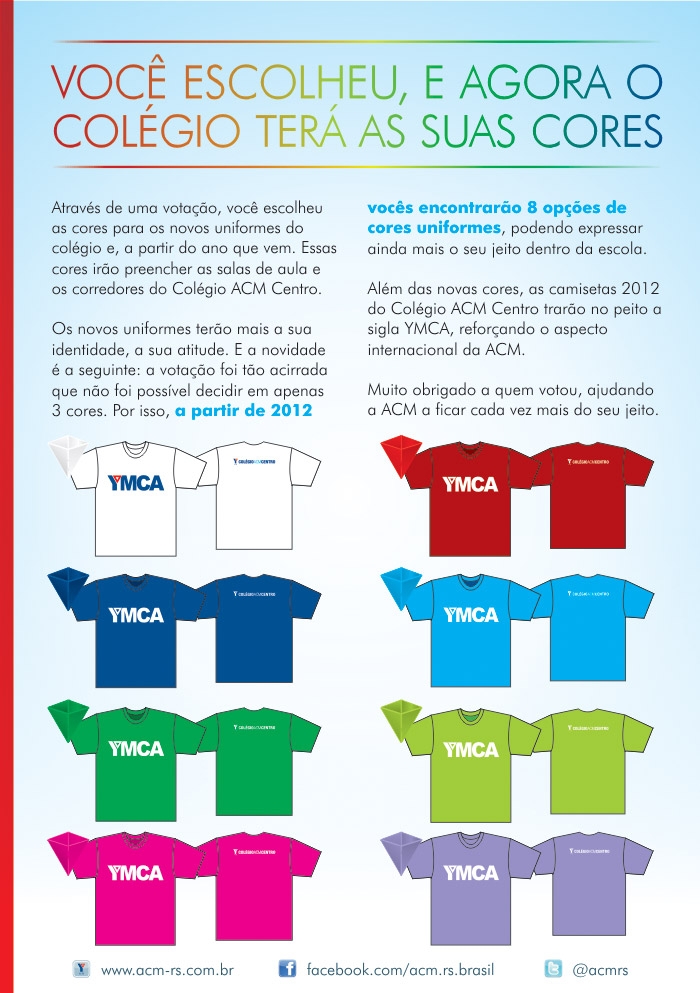 O Colégio ACM Centro realizou no início de dezembro, com estudantes da 5ª a 8ª série do Ensino Fundamental e do 1º e 2º ano do Ensino Médio, uma pesquisa para escolher as novas cores de uniformes do colégio, envolvendo e incentivando ainda mais os principais interessados neste tipo de vestuário: os estudantes.