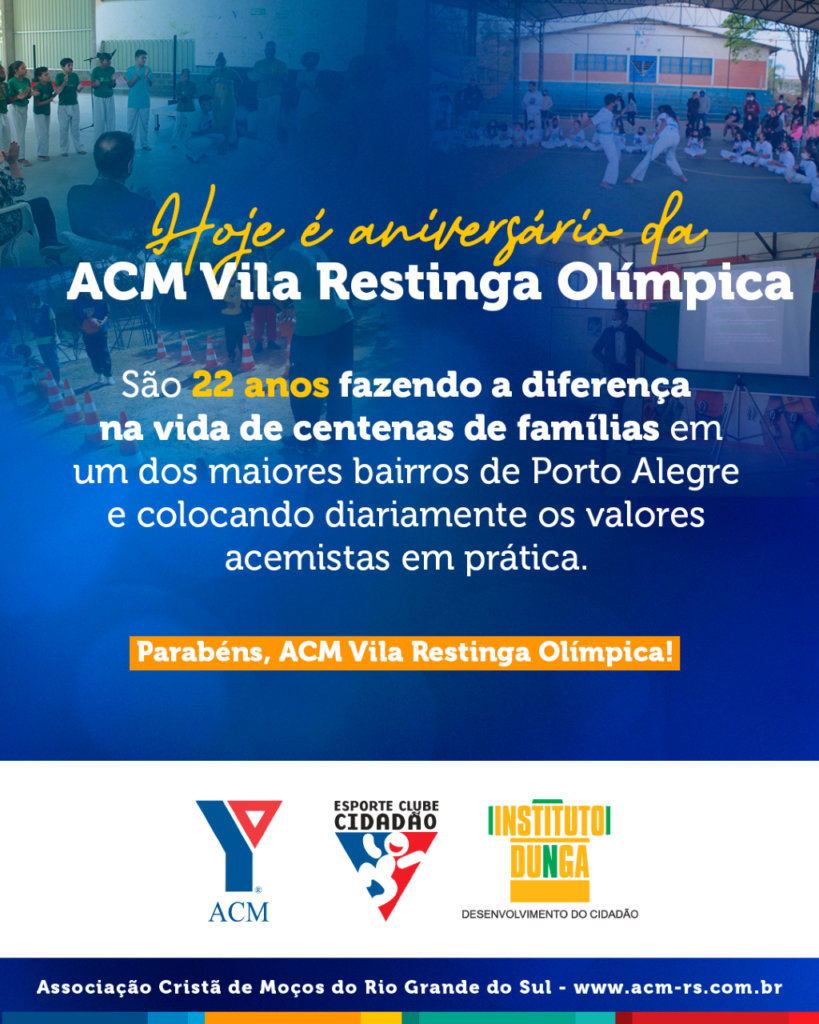 01 abril 2023 Aniversário da ACM Vila Restinga Olímpica Hoje é dia de celebrar o aniversário da nossa querida ACM Vila Restinga Olímpica! Somos muito felizes por ver a missão de cuidar de crianças e adolescentes da Restinga sendo cumprida. Parabéns, ACM Vila Restinga Olímpica! Gostou? Compartilhe essa notícia com seus amigos. Tweetar Compartilhar WhatsApp
