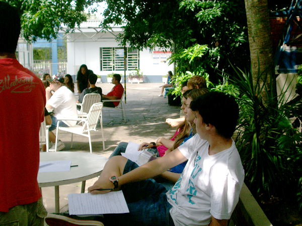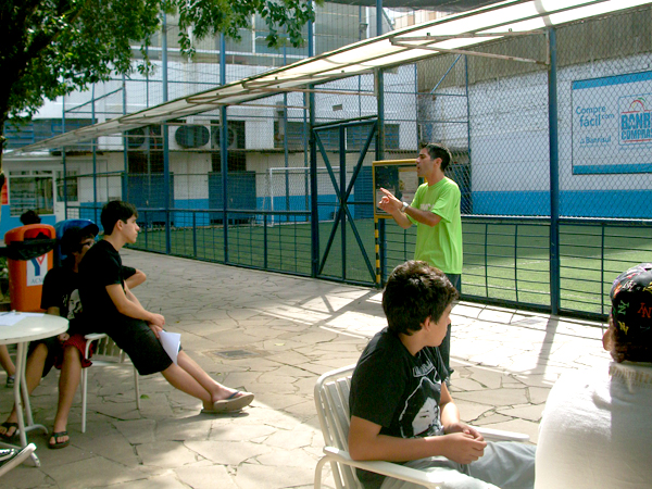 No primeiro dia de aula do ano, o professor Vinícius, de matemática, realizou uma aula ao ar livre com os alunos do 3º ano do Ensino Médio. A atividade ocorreu no pátio da escola e o conteúdo abordado teve como objetivo visualizar a geometria plana, espacial e suas propriedades. Com esta atividade, os alunos relacionaram as grandezas usadas em medidas e volumes e suas devidas transformações, com o uso de escalas.
