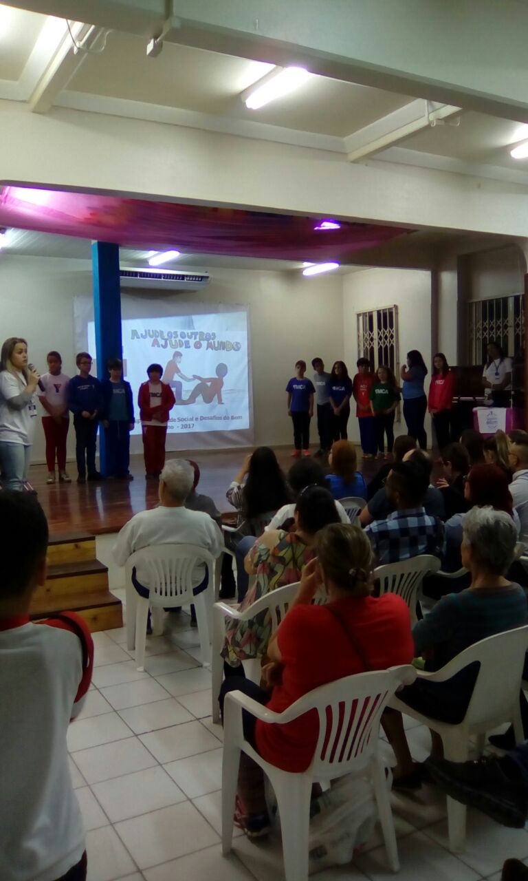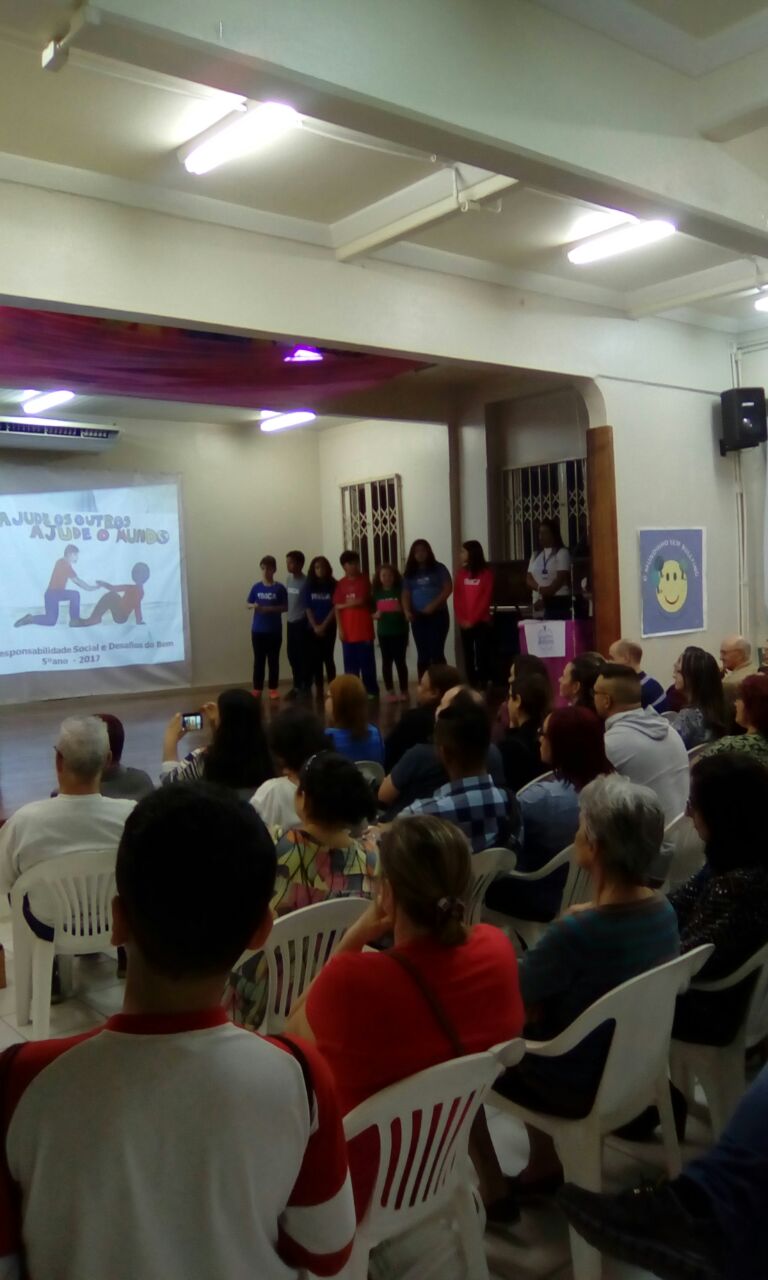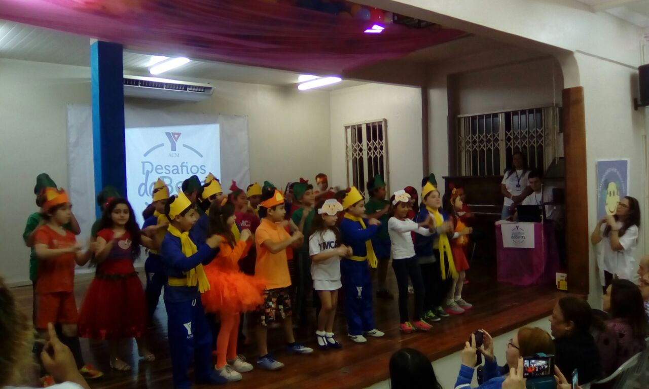 Em seguida, a turma 21 apresentou a música tema, composta pelo professor de música Duda, fazendo o auditório cantar em coro o refrão, que diz: “vem ajudar você também nos Desafio do Bem!“.