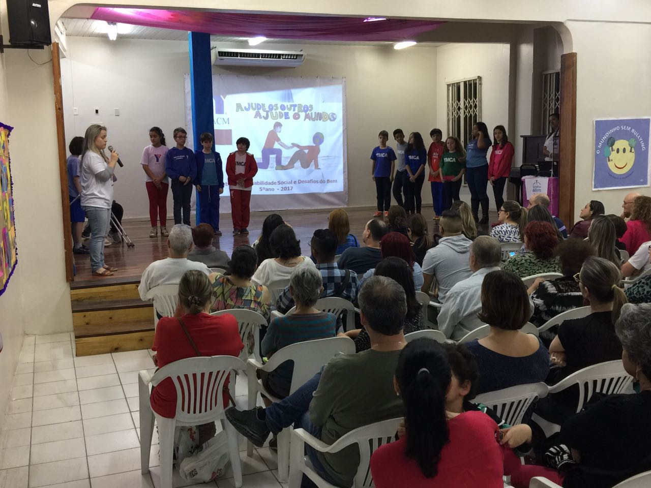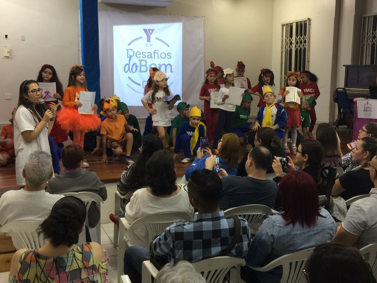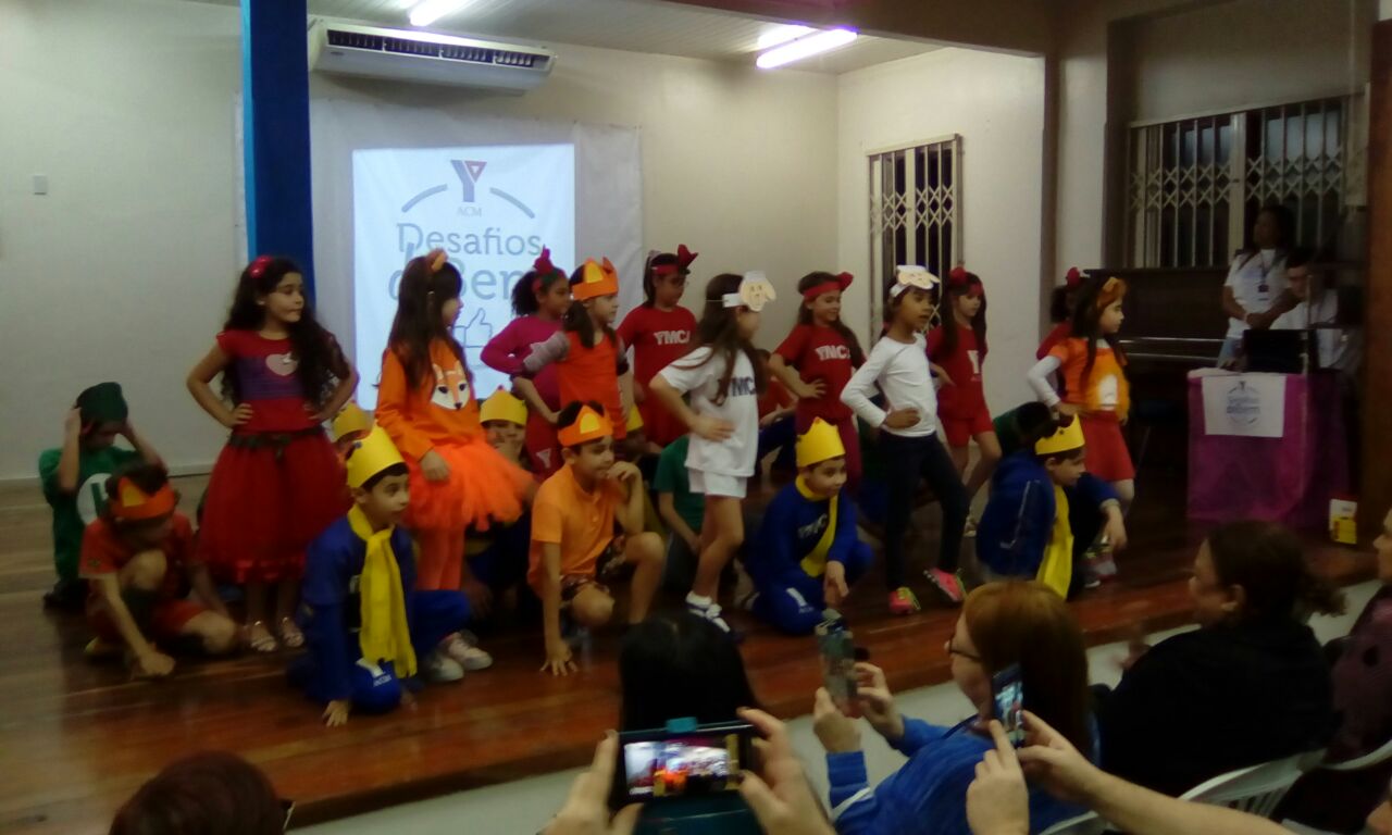 Em seguida, a turma 21 apresentou a música tema, composta pelo professor de música Duda, fazendo o auditório cantar em coro o refrão, que diz: “vem ajudar você também nos Desafio do Bem!“.