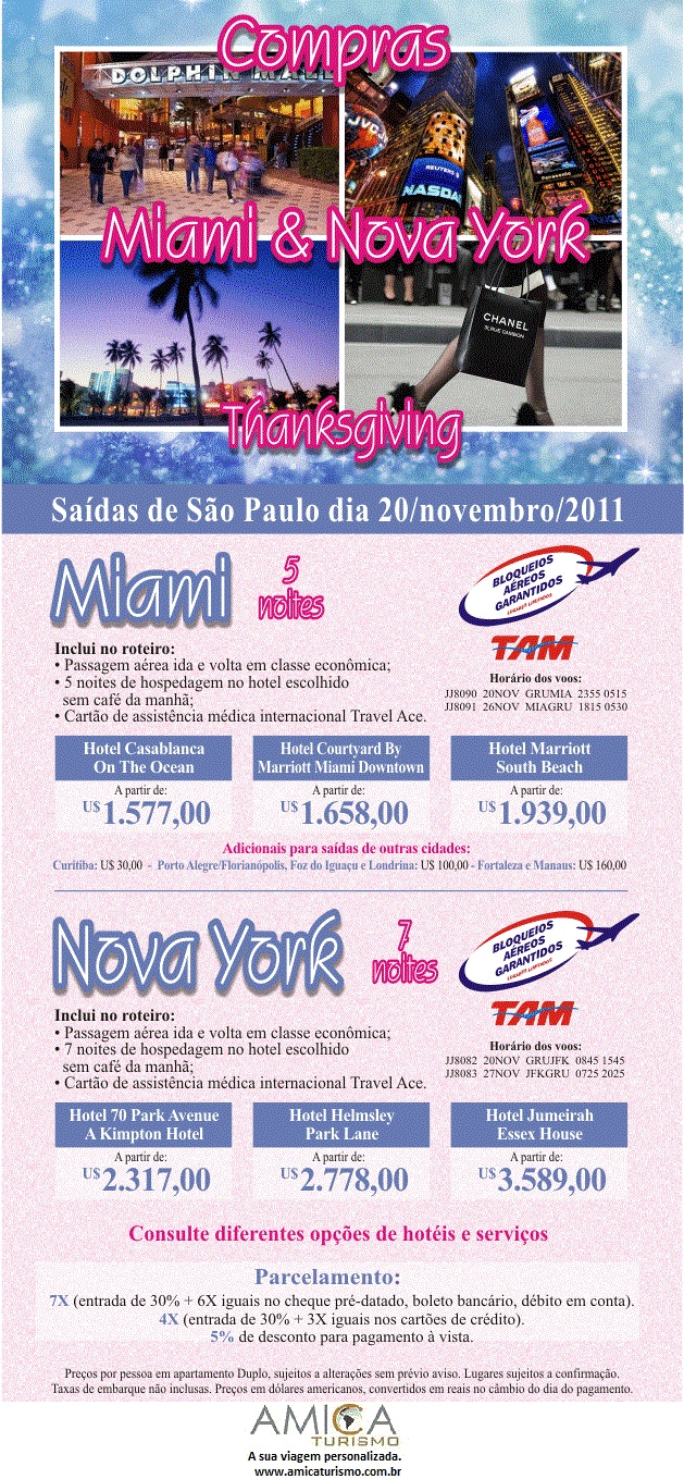 A ACM Internacional e a Amica Turismo montaram um roteiro de compras em Miami e Nova York para aproveitar o ótimo período de liquidação. Para mais informações sobre o pacote, entre em contato pelo telefone (51) 3024-3306.