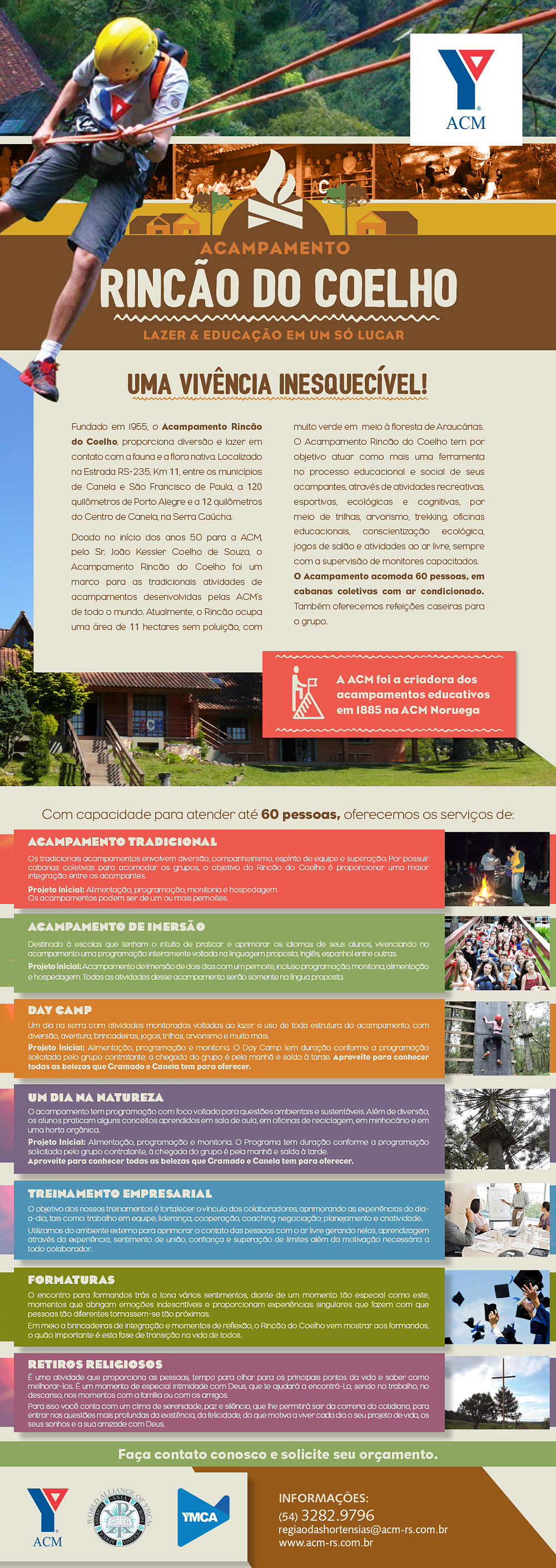 12 junho 2012 Conheça o Rincão do Coelho, acampamento educativo da ACM-RS Para informações completas acesse a página da ACM Região das Hortênsias neste site, através do menu ou clicando aqui Gostou? Compartilhe essa notícia com seus amigos. Tweetar Compartilhar WhatsApp