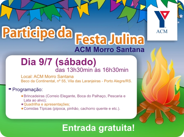 A ACM Morro Santana realiza no dia 9 de julho (sábado) sua Festa Julina. A comemoração tem entrada gratuita para toda a comunidade e irá acontecer das 13h30 às 16h30 na Unidade (Beco da Continental, nº 55, Vila das Laranjeiras – Porto Alegre).