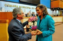 Presidente da ACM-RS homenageia as mães entregando flores para a presidente da Câmara, Sofia Cavedon