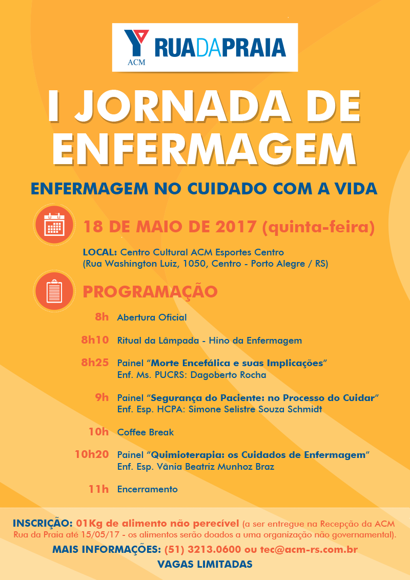 A ACM Rua da Praia convida os acadêmicos de Cursos Técnicos em Enfermagem para participarem da I Jornada da Enfermagem, que ocorrerá no dia 18 de maio em comemoração ao Dia do Técnico em Enfermagem.