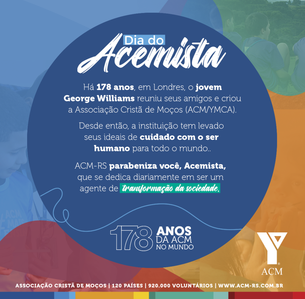 06 junho 2022 Parabéns para todos os Acemistas! Hoje é o dia em celebramos os 178 anos de criação da ACM no mundo. Parabéns para cada pessoa que se envolve com esta instituição e que busca diariamente ser um agente de transformação da sociedade. Feliz Dia do Acemista! Gostou? Compartilhe essa notícia com seus amigos. Tweetar Compartilhar WhatsApp