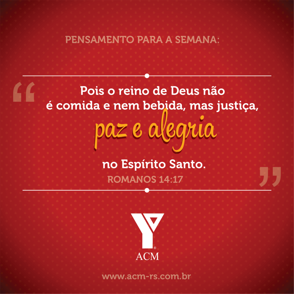 27 dezembro 2021 Pensamento da Semana Que a paz e a alegria que vem do Criador transborde em sua vida nesta semana. #acm#ymca#pensamentodasemana#bomdia Gostou? Compartilhe essa notícia com seus amigos. Tweetar Compartilhar WhatsApp