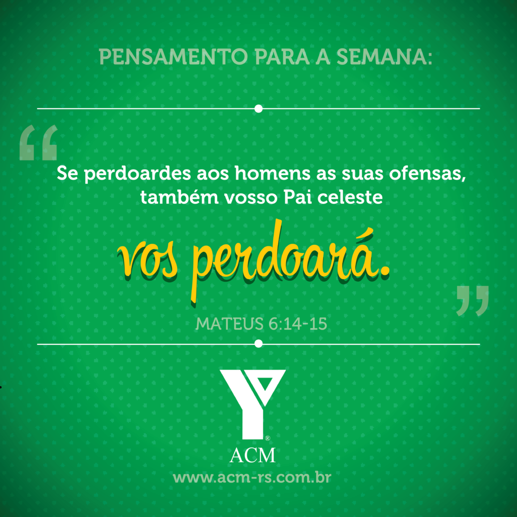 09 maio 2022 Pensamento da Semana O perdão é um princípio que nos ajuda a ter mais paz em nossa vida e um contato maior com o pai celestial. A ACM-RS te convida a colocar o perdão em prática na sua vida e também te deseja uma excelente semana. Gostou? Compartilhe essa notícia com seus amigos. Tweetar Compartilhar WhatsApp