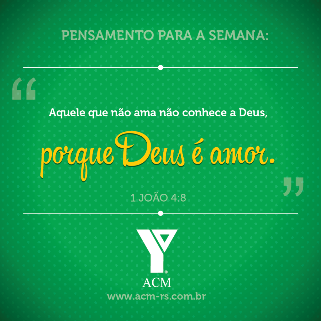 18 julho 2022 Pensamento da Semana Devemos amar uns aos outros como Deus nos amou. A capacidade de amar é o maior presente que nosso pai celestial deixou para cada ser humano. A ACM-RS te deseja uma excelente semana. Gostou? Compartilhe essa notícia com seus amigos. Tweetar Compartilhar WhatsApp