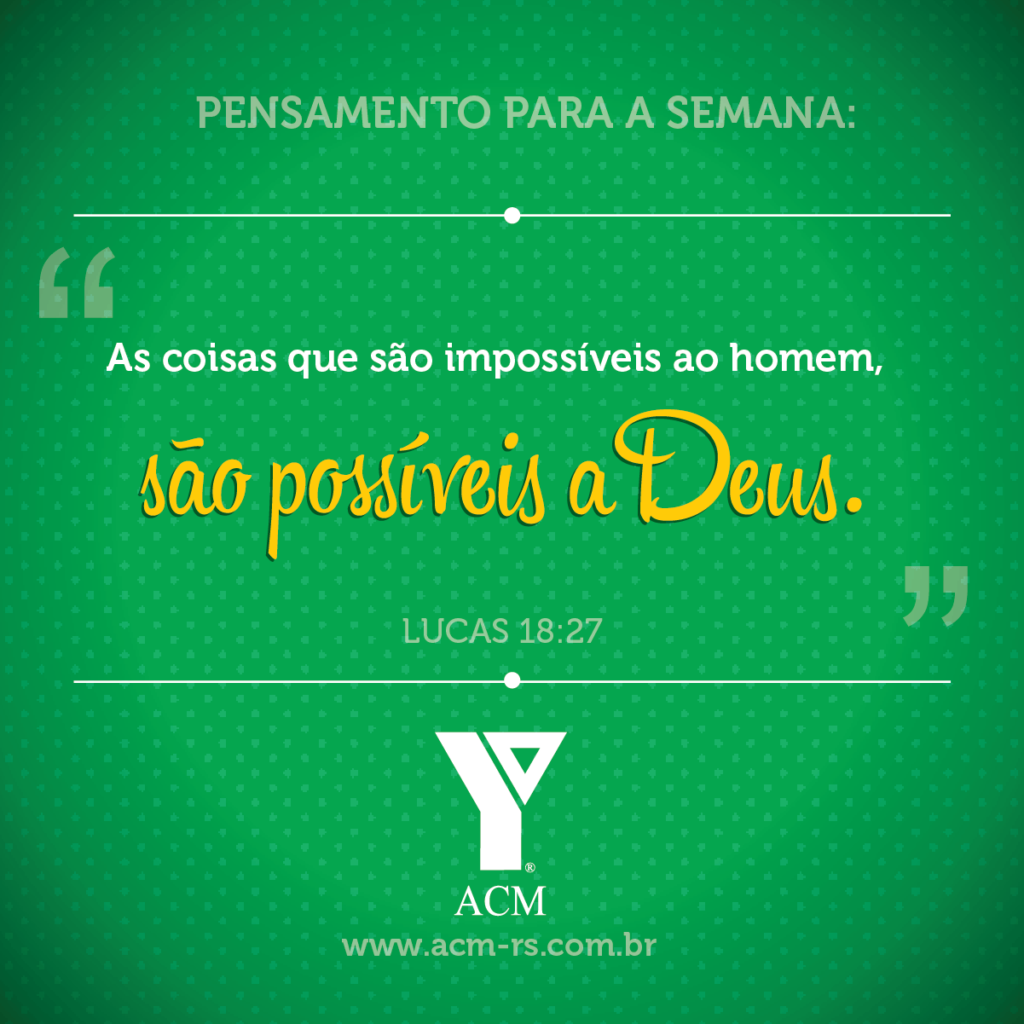 25 julho 2022 Pensamento da Semana Sempre que sentir fraco ou pensar que algum objetivo não é possível ser alcançado, pense em Deus. Para ele, nada é impossível. A ACM-RS deseja uma ótima semana para você. Gostou? Compartilhe essa notícia com seus amigos. Tweetar Compartilhar WhatsApp