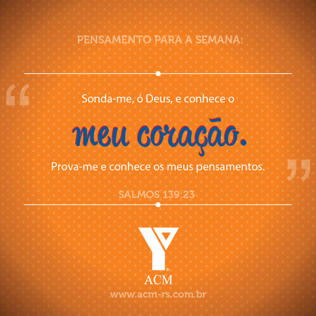 23 outubro 2022 Pensamento da Semana Deus é o único que sabe o que se passa no seu coração e conhece os seus anseios. A ACM-RS te deseja uma ótima semana! Gostou? Compartilhe essa notícia com seus amigos. Tweetar Compartilhar WhatsApp
