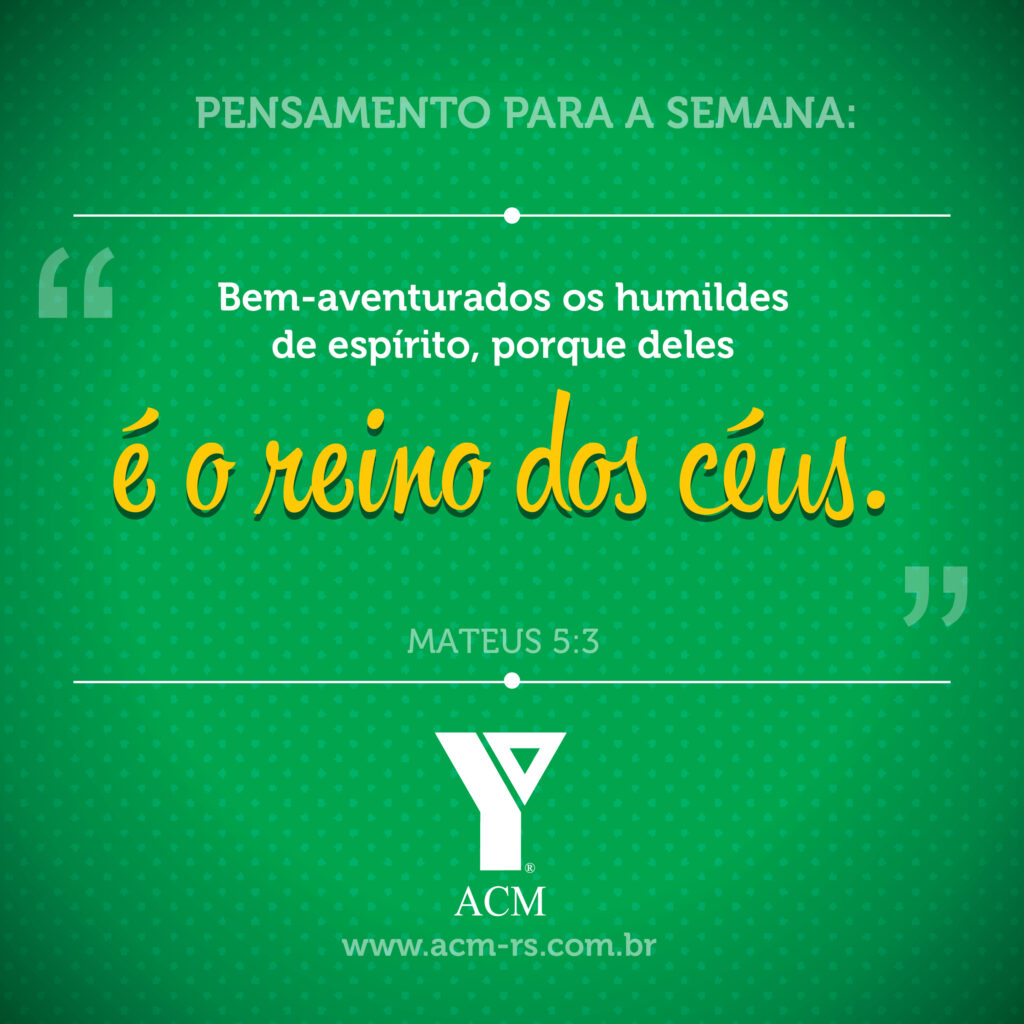 20 março 2023 Pensamento da Semana A humildade é um dos princípios fundamentais de Deus. Ela é essencial para estarmos mais próximos do nosso Criador. A ACM-RS te deseja uma ótima semana! Gostou? Compartilhe essa notícia com seus amigos. Tweetar Compartilhar WhatsApp