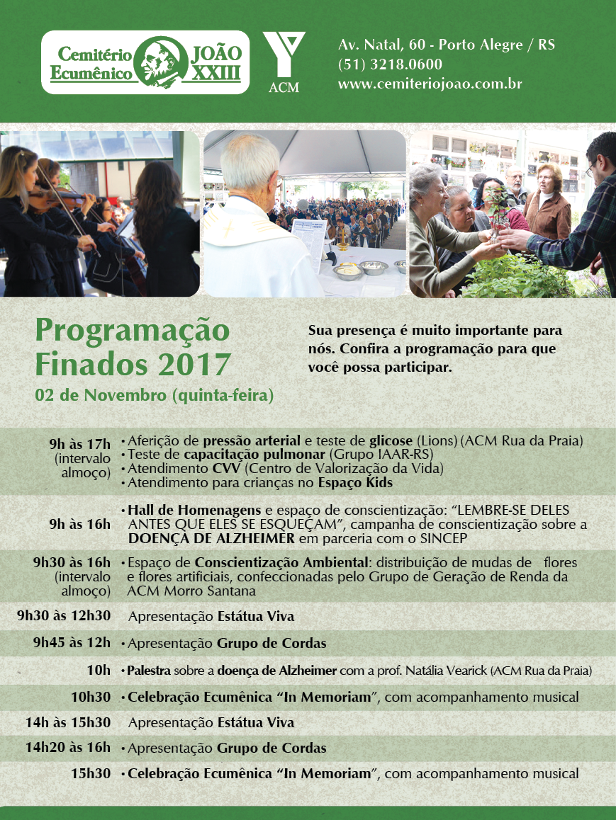 O Cemitério João XXIII, unidade da ACM-RS, preparou uma programação especial para receber seus visitantes no dia 02 de novembro para a celebração do Dia de Finados.