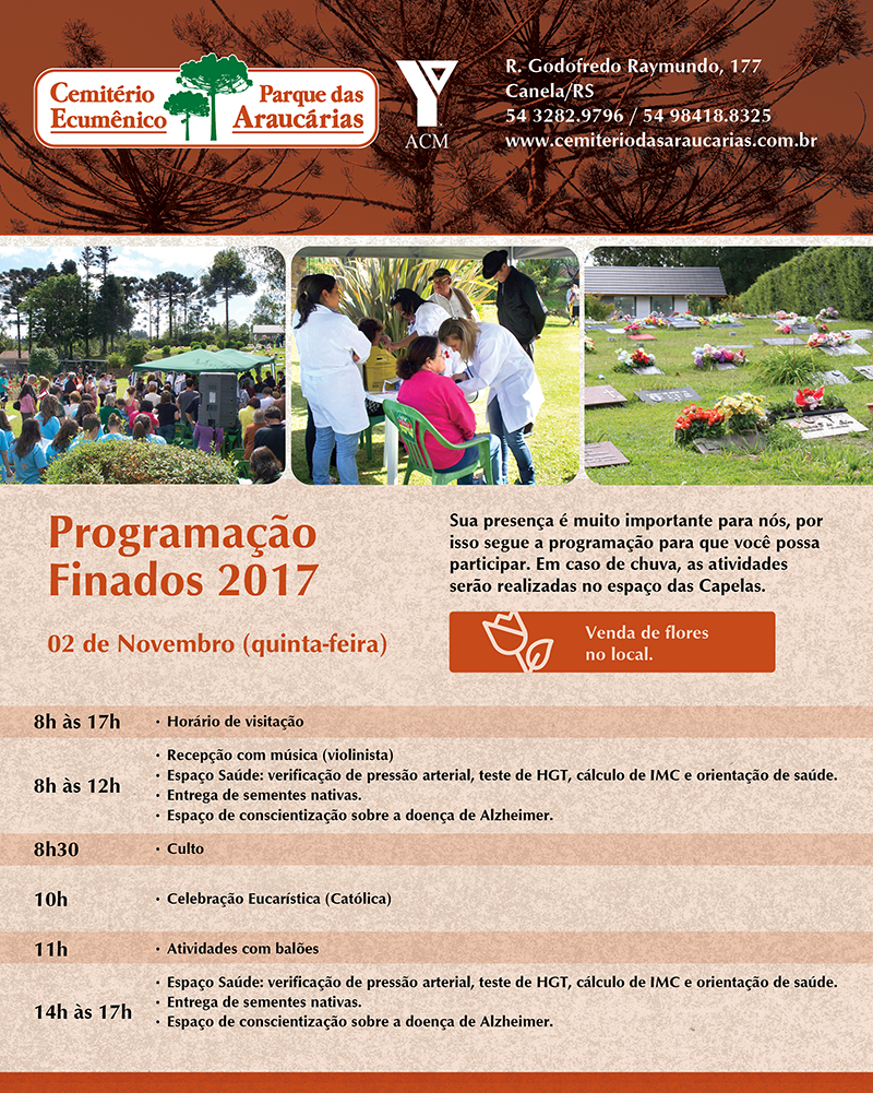 O Cemitério e Crematório Ecumênico Parque das Araucárias, unidade da ACM-RS localizada em Canela/RS, preparou uma programação especial para receber seus visitantes no dia 02 de novembro para a celebração do Dia de Finados.