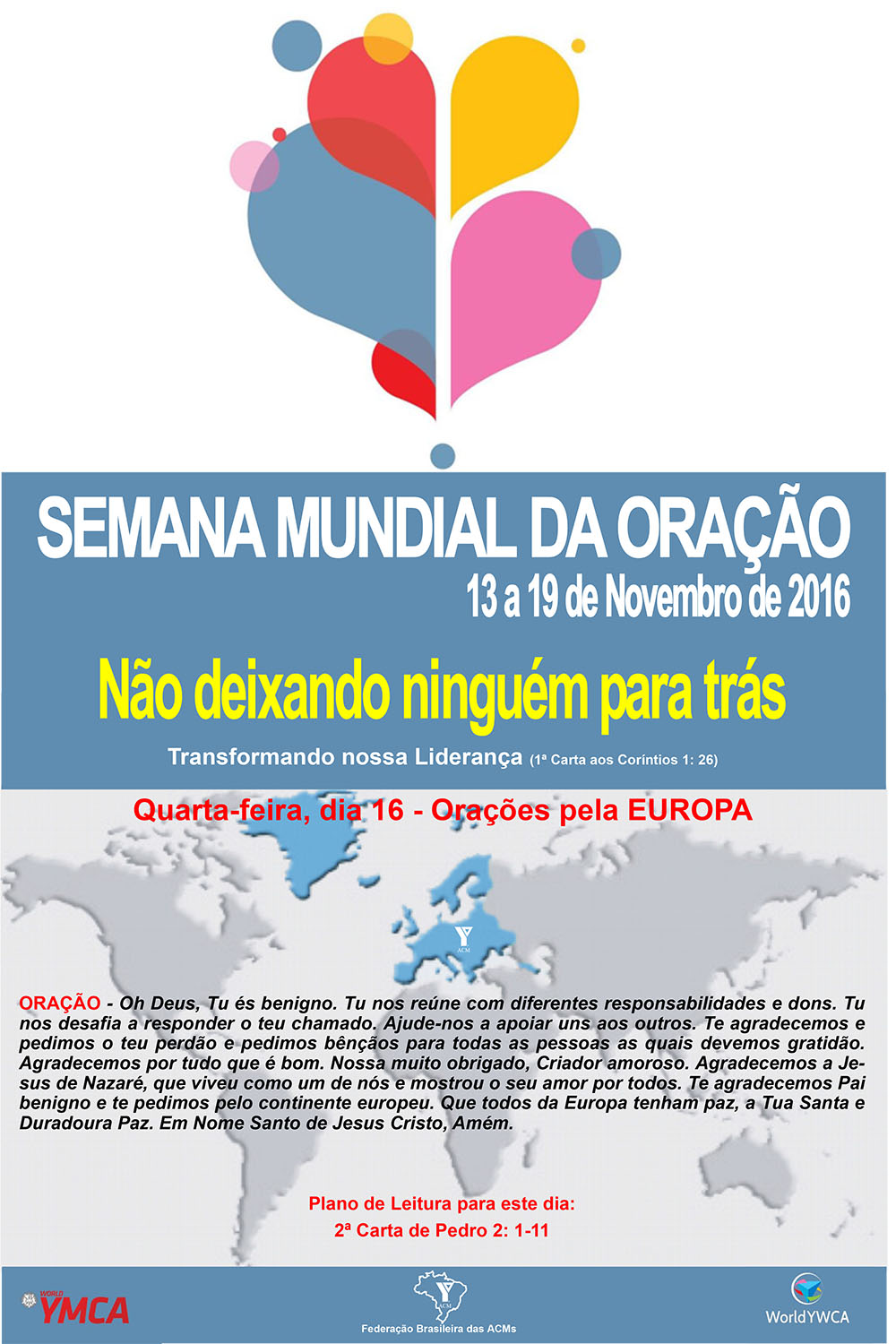 16 novembro 2016 Semana Mundial da Oração – Orações pela EUROPA Confira a orientação para este quarta-feira e organize seu grupo de oração. Gostou? Compartilhe essa notícia com seus amigos. Tweetar Compartilhar WhatsApp