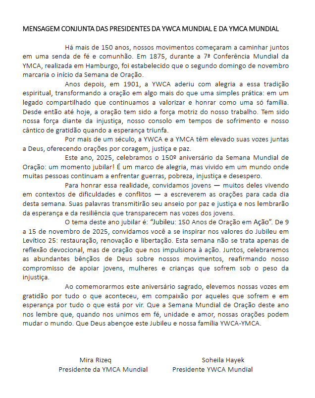 O livreto da Semana Mundial de Oração de 2025 oferece seis devocionais diários e um culto comunitário opcional para o sétimo dia. Como um acréscimo especial para o aniversário da ACM (Associação Cristã de Moços), incluímos um breve histórico da Oração Mundial como prólogo antes do início das orações diárias.