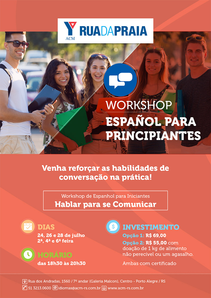 A partir do dia 24 de julho (próxima segunda-feira), o Curso de Idiomas da ACM Rua da Praia iniciará os Workshops de Inglês e Espanhol.